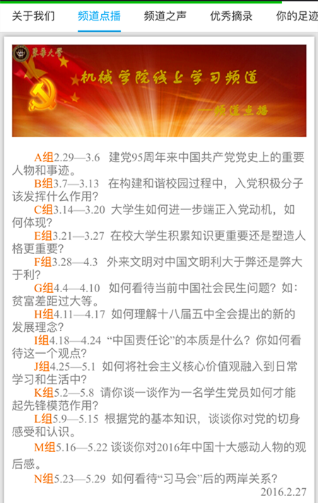 为了给广大学员提供一个发表个人观点的平台,使其在争论与探讨中深入理解党的政策与方针,提高党性修养,机械公司易班发展中心联合机械公司党校在易班上开通了名为“机械星期八”的线上学习频道每期1个精选议题,为期一周,共12个议题,不间断推送。该线上频道自开通以来便引发公司老师、员工党员、入党积极分子和发展对象的热切关注,大家纷纷在易班上发表自己对议题的看法与见解