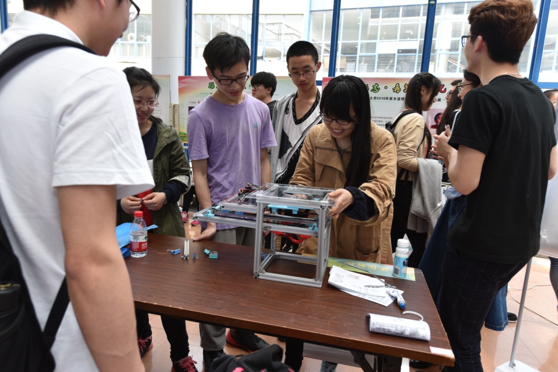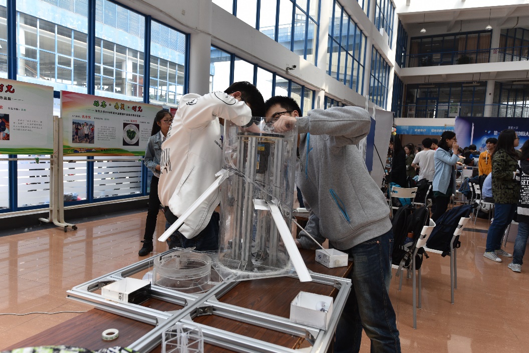 本次比赛不同于传统的形式,以现场问辩的方式进行评比。大赛开幕后,各组参赛选手依次进行作品展示与问辩,评委根据作品选题、设计、制作和现场展示等方面来进行评价。比赛主题为钱币分拣、商品包装、商品载运和助力装置等三类,各组创意丰富、新奇巧妙的作品吸引了在场的同学,大家纷纷驻足观看。
