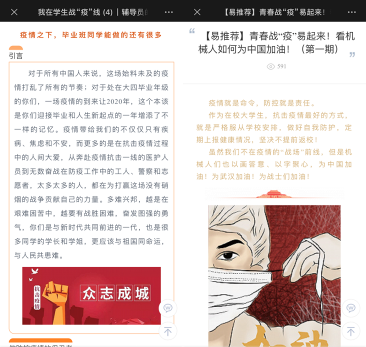 公司密切关注员工的思想和心理状态,加强疫情期间员工的网络思政教育和爱国主义教育。以易班网络思政平台为主阵地,面向师生等不同群体开设“我在员工战‘线堡垒春战‘疫’易起来”专栏,通过辅导员的日记、空中系列主题班会、抗“疫”文艺作品等形式,讲好疫情防控中的中国故事,利用这一场没有硝烟的“全员战争”,借助社会这个“大课堂”、人民群众这位“好老师”,上好一堂生动而难忘的爱国主义“思政大课”。