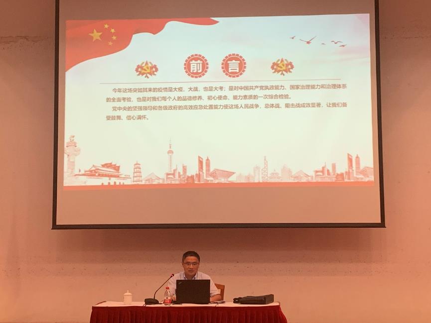 张千里同志带领大家回顾了疫情发生以来,党中央做出的一个个重大决策,重温了习近平总书记关于防控的指示批示。张千里书记指出在这场战役中,党中央的坚强领导和各级政府的高效应急处置能力使这场人民战争,总体战、阻击战成效显著,让我们备受鼓舞、信心满怀。社会上各行各业的战“疫”英雄们闻令而动、向战前行的身影,奋不顾身、不畏艰险的壮举以及普通老百姓们的同舟共济,从这次抗击疫情中可以看到了党的领导始终是战胜一切艰难险阻的“关键核心”、看到了坚持和发展社会主义制度始终是实现强国复兴的根本之路、看到了依靠和发动人民群众始终是一切工作的“制胜法宝”、看到了冲锋在前的共产党员始终是紧要关头的信心和信赖、看到了中华民族伟大复兴的强国梦已经指日可期。