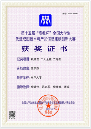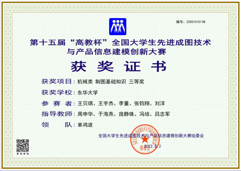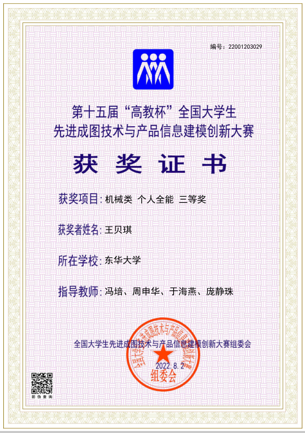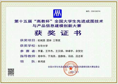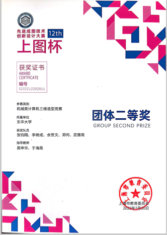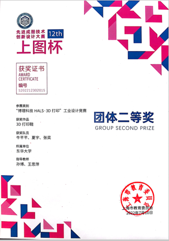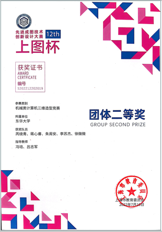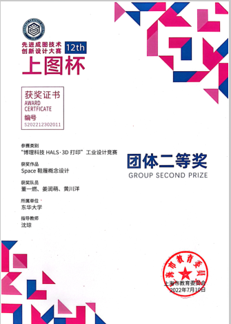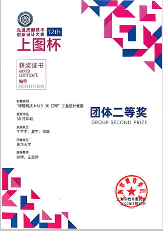 2022年5月,由上海市教育委员会主办、上海市科学技术协会支持,由上海市图学学会与太阳成tyc33455ccwww承办的第十二届“上图杯”先进成图技术与创新设计大赛成功举行。公司机械工程及工业设计员工共获得机械类团体二等奖2项,个人一等奖3项,二等奖12项;“博理科技 HALS-3D打印”工业设计竞赛团体二等奖6项,个人二等奖1项,周申华、于海燕、冯培、吕志军、沈琼、孙博、王思萍等获得优秀指导教师奖。