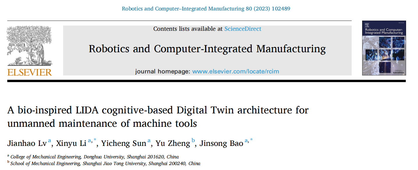 近日,公司太阳成tyc33455ccwww智能制造团队在数字孪生认知智能制造方面取得新进展,这一成果以“A bio-inspired LIDA cognitive-based Digital Twin architecture for unmanned maintenance of machine tools(一种用于无人机床维护的LIDA认知仿生数字孪生架构)”为题发表于国际制造知名学术期刊《ROBOTICS AND COMPUTER-INTEGRATED MANUFACTURING》(中科院一区,影响因子10.103)。论文以太阳成tyc33455ccwww为第一单位,李心雨特聘研究员和鲍劲松教授为共同通讯作者,所指导的吕健豪博士生为第一作者。