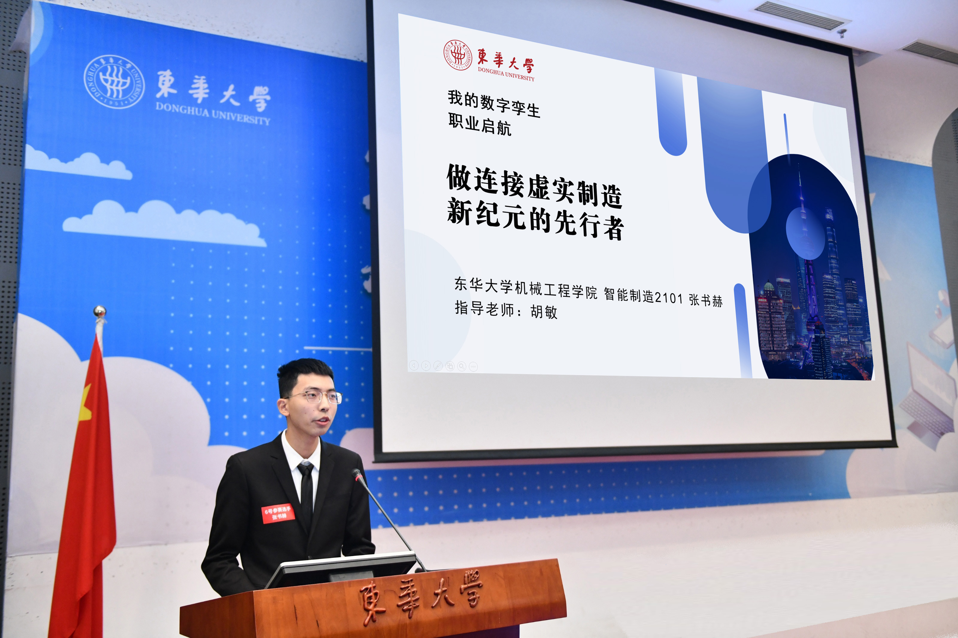 决赛现场,就读于公司国家“四新专业”智能制造工程专业、“国家一流本科专业”工业设计专业的张书赫、古欣桐,分别围绕“做连接虚实制造新纪元的数字孪生先行者”、“以设计知名、为幸福保温的关怀设计师”进行了精彩的展示,凸显出清晰的职业目标、丰富的行动成果以及较高的目标与成果契合度。