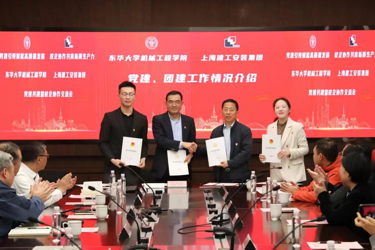 为进一步以党建引领赋能高质量发展,为发展新质生产力提供新动能,近日,机械公司与上海建工安装集团党团共建协议签约仪式暨校企协作要素对接会在上海建工安装集团总部举行。机械公司党委书记王新厚,上海建工安装集团党委副书记、工会主席秦凯凯出席,机械公司教师党支部书记、系主任、青年教师代表以及上海建工安装集团下属单位负责人、技术骨干、员工代表等参加活动。