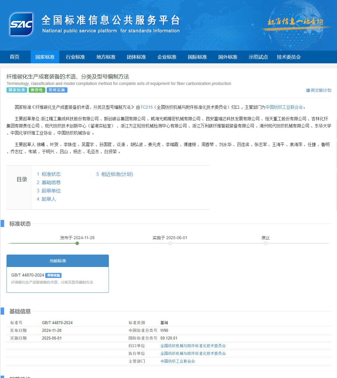 近日,国家市场监督管理总局(国家标准化管理委员会)发布了2024年第29号《中华人民共和国国家标准公告》,由公司参与制订的国家标准GB/T 44870-2024《纤维碳化生产成套装备的术语、分类及型号编制方法》正式获批发布。该标准由TC215(全国纺织机械与附件标准化技术委员会)归口 ,主管部门为中国纺织工业联合会,主要起草单位为浙江精工集成科技股份有限公司 、新创碳谷集团有限公司 、威海光威精密机械有限公司 、西安富瑞达科技发展有限公司 、恒天重工股份有限公司 、吉林化纤集团有限责任公司 、现代纺织技术创新中心(鉴湖实验室) 、浙江方正轻纺机械检测中心有限公司 、浙江万利碳纤维智能装备有限公司 、湖州现代纺织机械有限公司 、太阳成tyc33455ccwww 、中国化学纤维工业协会 、中国纺织机械协会 。纺织装备教育部工程研究中心全程参与此次标准制定,李姝佳老师排名第3。